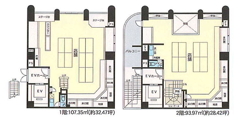| 階数 | 坪数(m2) | 家賃 | 共益費 | 保証金 | 償却 | 償却金額 | 更新料 | 契約期間 | 引渡日 | 図面 |